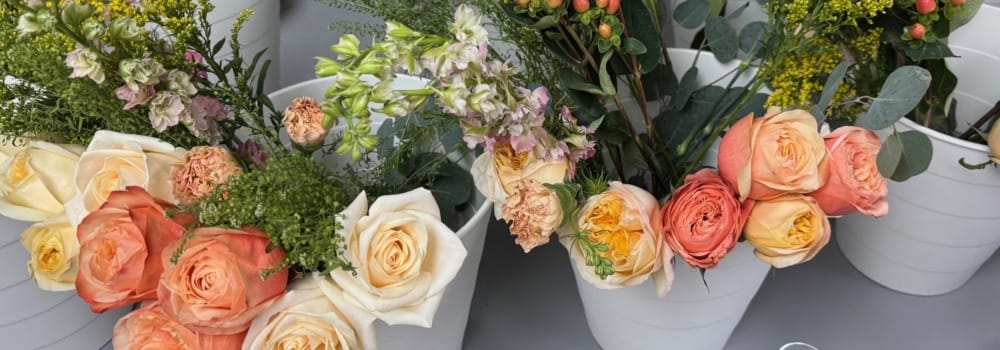 To be honest, at first, I found it all quite daunting. Eleven of us were crowded elbow-to-elbow around the working table, and it seemed unrealistic that I’d be able to corral the profusion of peach and pink roses and all the textural yellows and greens that were poking out of white water buckets into a cohesive arrangement in the small vase in front of me. The chicken wire at the base of the vase seemed to be on my side, but I felt way out of my league, especially when I looked at the sample so beautifully assembled by an actual professional.