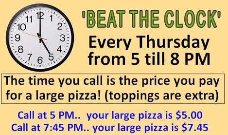 This “Beat the Clock” special at Lettopalena’s, one of my hometown mom-and-pop pizza shops, is my favorite marketing gig lately. Here is why:
